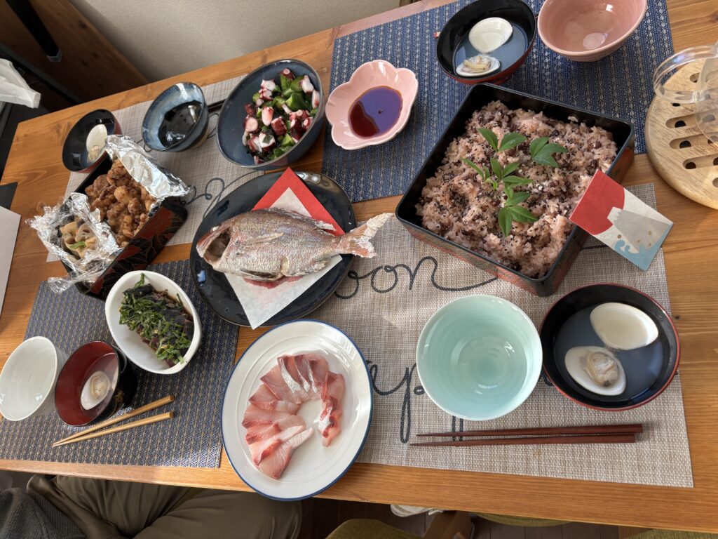 わたしは鯛とお吸い物、お刺身を担当。そのほかは全部母が持ってきてくれました(感謝)。